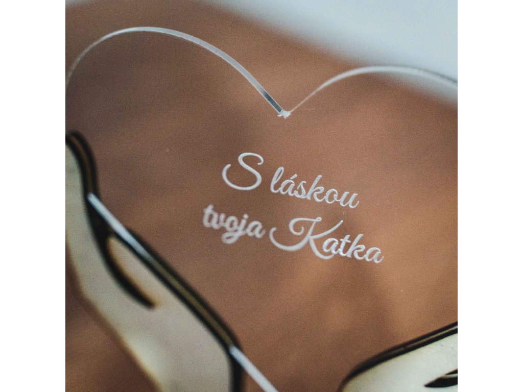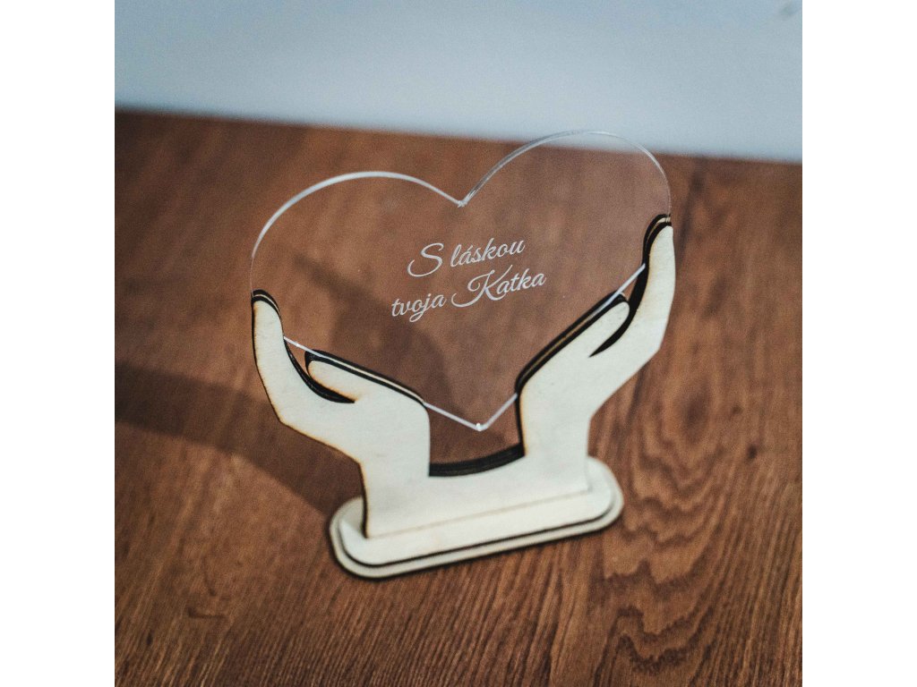 - Dizajn: Priehľadné akrylové srdce gravírované podľa vášho výberu, držiace drevenými rukami.